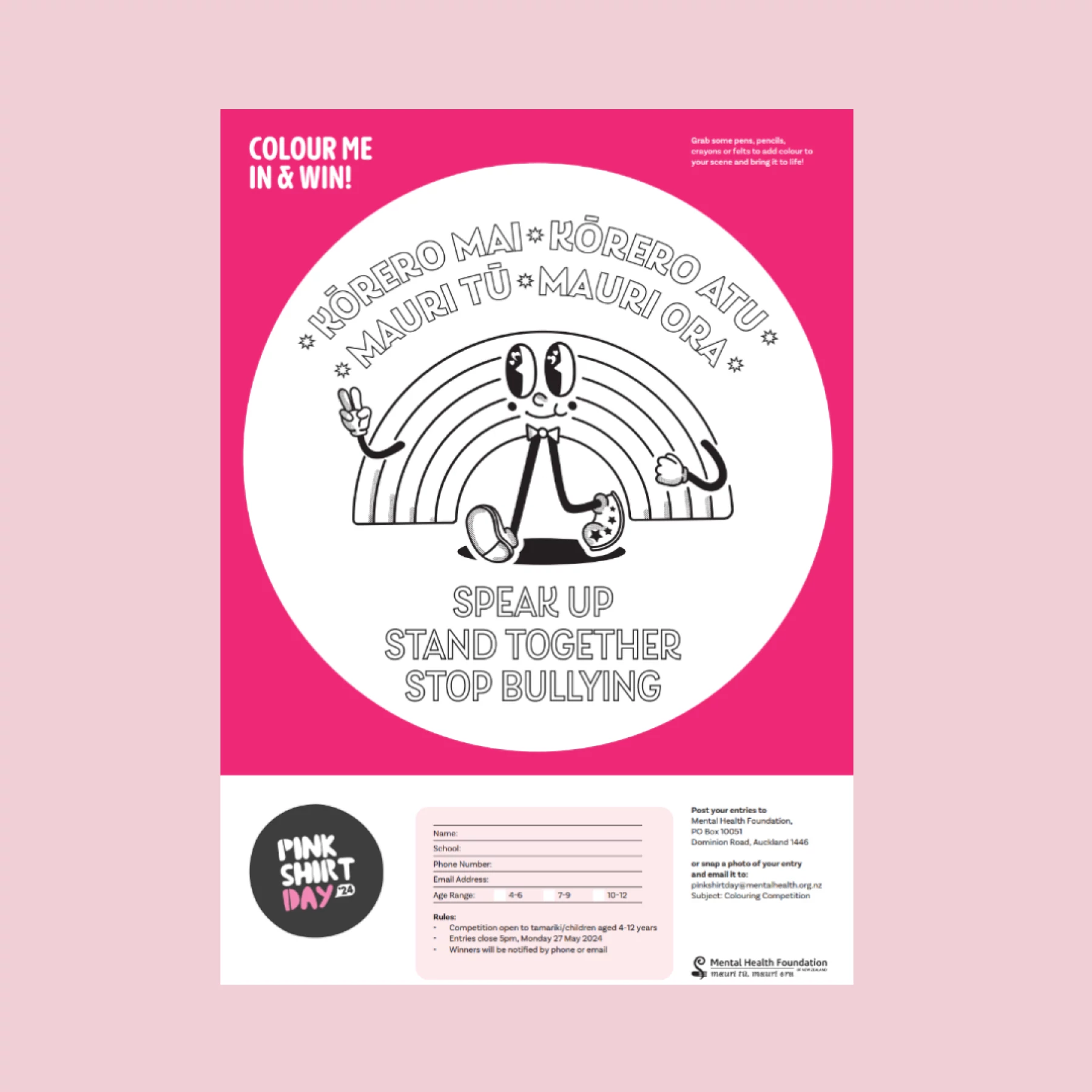 A fun competition for tamariki to get creative and add their own flair to our Pink Shirt Day rainbow character as featured on the official t-shirt.