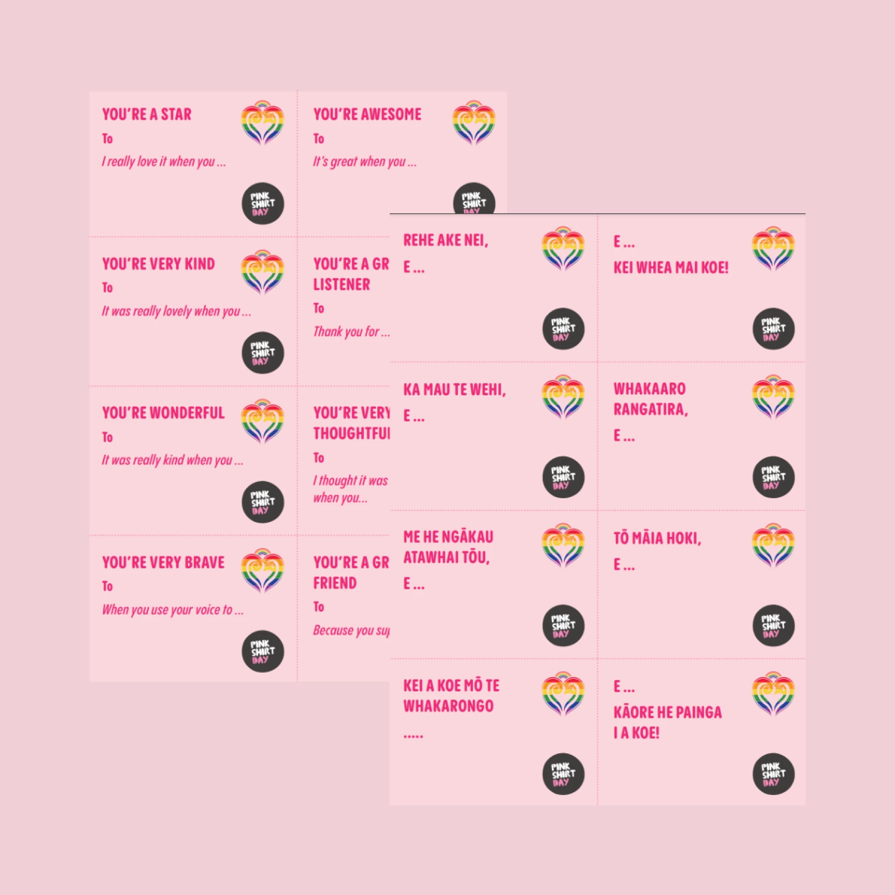 Celebrate kindness by giving out compliment cards to students on Pink Shirt Day - available in English and Te Reo Māori.